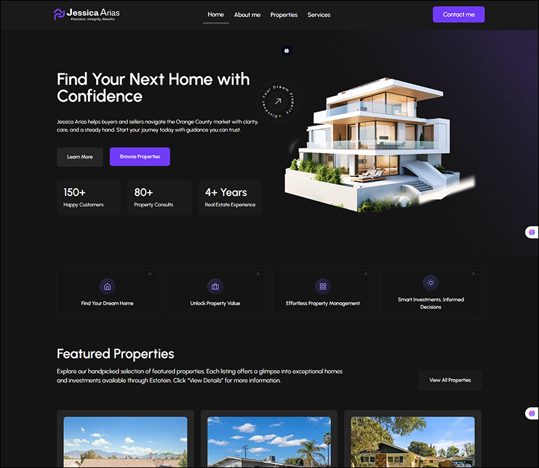 This design features a bold hero section, focused property modules, trust indicators, and intuitive CTAs.Optimized for both desktop and mobile, it empowers agents to present listings beautifully, build trust quickly, and convert qualified leads with ease.